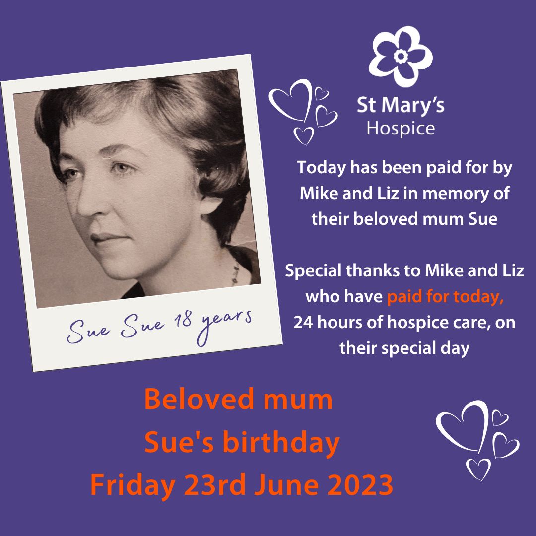 We are so grateful to Mike and Liz for their generous act of kindness in donating 24 hours of hospice care today, 23rd June, in loving memory of their mum, Sue George, on her birthday.